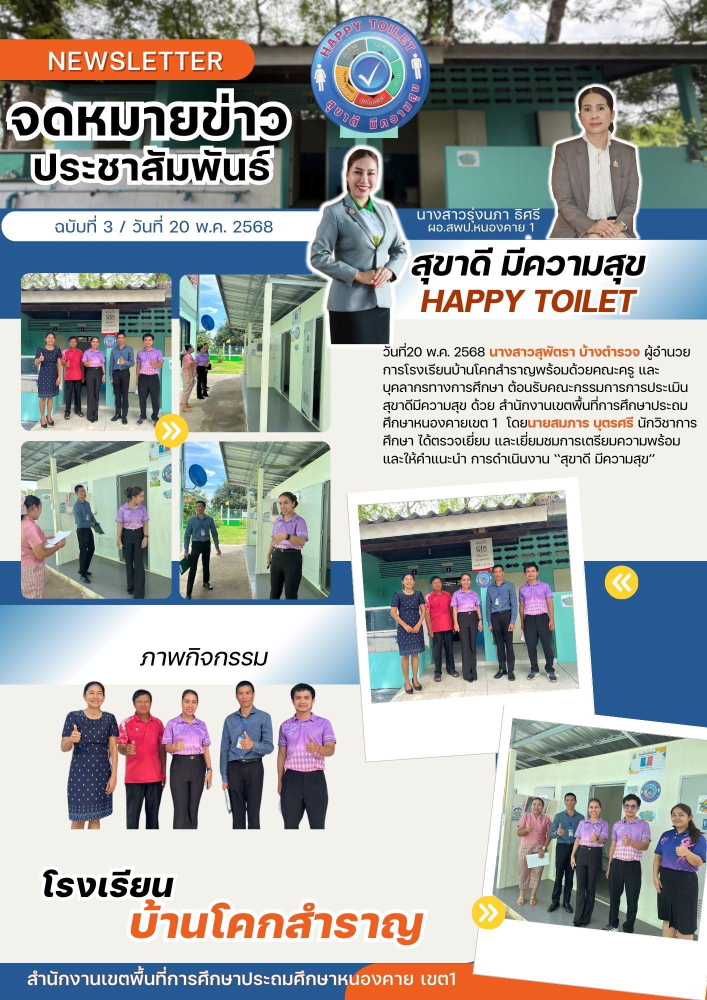 วันที่ 20 พ.ค. 2568 นางสาวสุพัตรา บ้างตำรวจ ผู้อำนวยการโรงเรียนบ้านโคกสำราญพร้อมด้วยคณะครู และบุคลากรทางการศึกษา ต้อนรับคณะกรรมการการประเมิน สุขาดี มีความสุข จากสำนักงานเขตพื้นที่การศึกษาประถมศึกษาหนองคายเขต 1 โดยนายสมภาร บุตรศรี นักวิชาการศึกษา ได้ตรวจเยี่ยม และเยี่ยมชมการเตรียมความพร้อม และให้คำแนะนำ การดำเนินงาน ‘‘สุขาดี มีความสุข‘‘